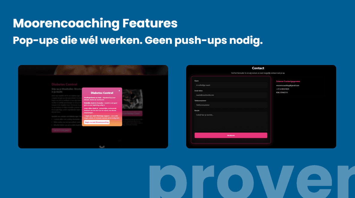 Moorencoaching had behoefte aan meer interactie en duidelijkheid voor nieuwe klanten. Daarom hebben we meerdere functies toegevoegd die direct bijdragen aan conversie en gebruiksgemak: